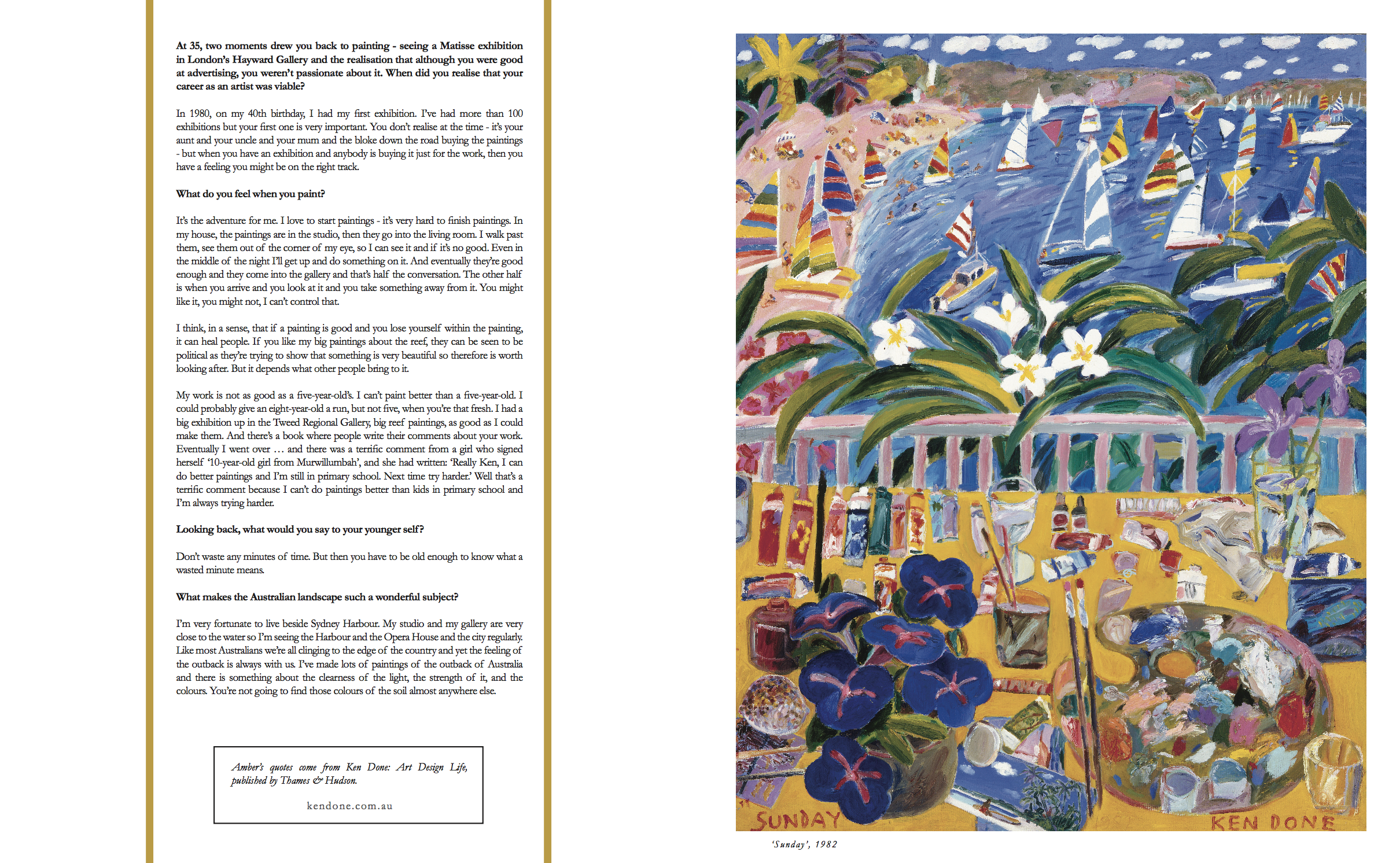 Sydney Harbour has always captivated Ken Done, the glittering, glorious icon painted onto countless canvases - alongside scenes from the Bungle Bungles, Kati Thanda (Lake Eyre), Broken Hill and considerably further afield. He creates these works in his studio overlooking Chinamans Beach, using plastic spades abandoned along the waterfront as his palettes. Never one to conform to artistic trends, Ken is drawn to words like ‘pretty’ and ‘beautiful’, and they define his vibrant, joyous style perfectly. He is kind, prolific and - by and large - remembers every painting he’s ever done.