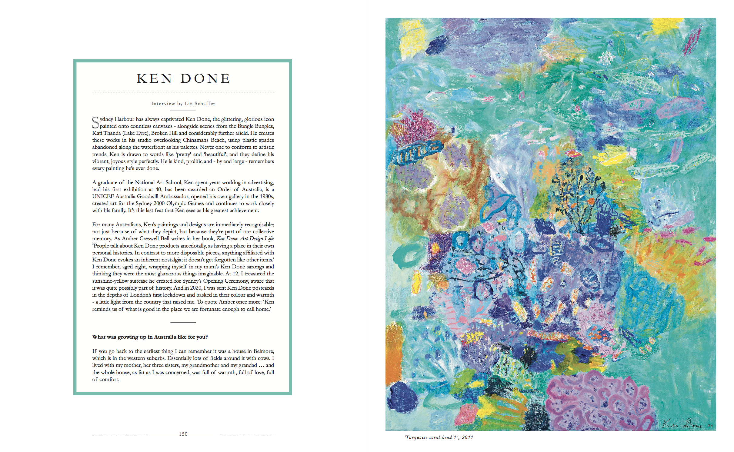 A graduate of the National Art School, Ken spent years working in advertising, had his first exhibition at 40, has been awarded an Order of Australia, is a UNICEF Australia Goodwill Ambassador, opened his own gallery in the 1980s, created art for the Sydney 2000 Olympic Games and continues to work closely with his family. It’s this last feat that Ken sees as his greatest achievement.